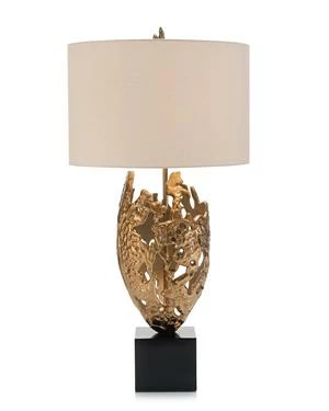Golden Bronze Chasm Vessel Table Lamp with Black Base. Shade:17.5″ X 17.5″ X 10.5″, Oat outside and Light Oat inside, Man Made Linen – Man Made Linen, Round Shade. 3 Way, 150 Watt Max, Type A Bulb, 8.5″ Gold Harp, Turnkey.