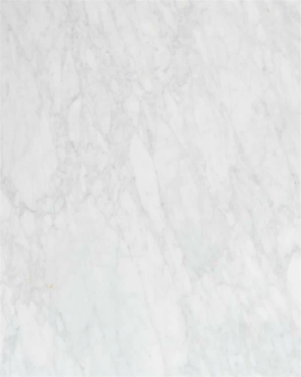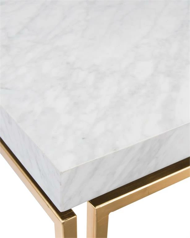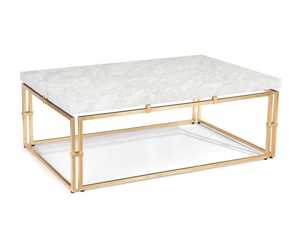 The Carrara marble top of this cocktail table is supported by a steel base finished in gold. The base features double legs strapped together with ties, which are repeated underneath the top.