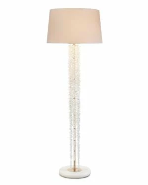 Stunning strands of cascading crystals drape from this antique silver floor lamp. Shade: 21″ X 24″ X 14″, White, Man-Made Silk. 1 Way, 60 Watt Max, Type A Bulb, 12″ Nickel Harp