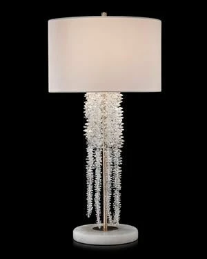 Stunning strands of cascading crystals drape from this antique silver table lamp with a white alabaster base. Shade: 17″ X 17″ X 10.5″, White, Cotton. 1 Way, 60 Watt Max, Type A Bulb, 8.5″ Nickel Harp