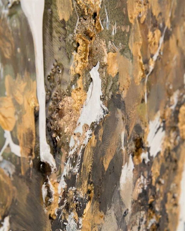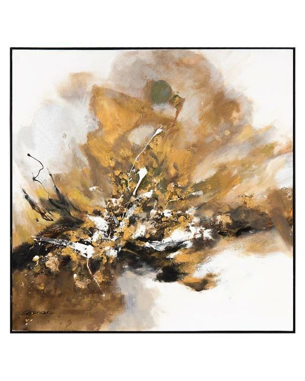 This original oil by artist Chen Qi is a textural explosion of golds, black, and deep grays. The piece is finished with a black wood molding.