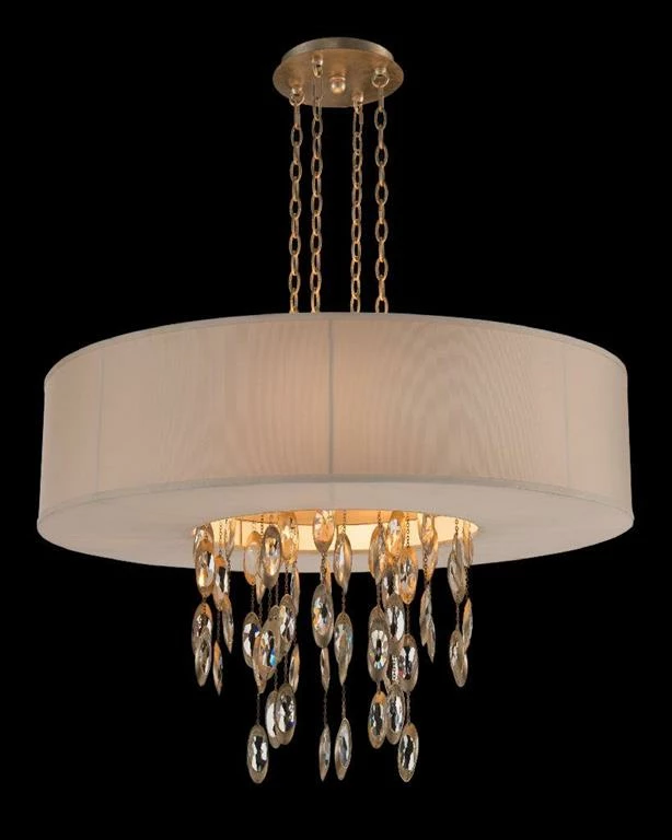 This pendant chandelier has a cool white fabric shade. The faceted crystals are suspended in metal settings cut on the bias. Shade: 36″ X 36″ X 9″, Cool White, Cotton. Medium Base, 60 Watt Max, Type A Bulb, Canopy: 8.25″, Chain: 10′Â