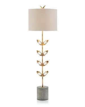 Crystal Bud Buffet Lamp in Antique Gold Leaf with a concrete base. Shade: 11″ X 11″ X 8″. Off White outside and inside, Man-made Linen – Man-made Silk, Round Shade. 1 Way, 60 Watt Max, Type A Bulb, No Harp, Line Switch.