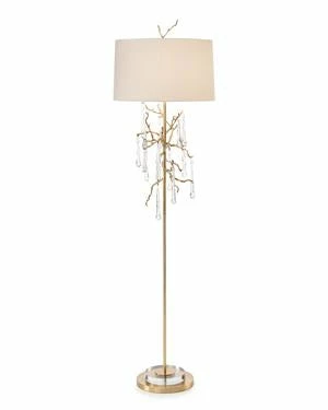 Organic antique brass branched console lamp with quartz crystal flower blooms on marble base. Shade: 18″ X 18″ X 11″. Off White outside and White inside, Man-made Silk – Man-made Silk, Round Shade. 3 Way, 150 Watt Max, Type A Bulb, 9.5″ Gold Harp.