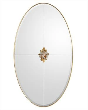 A simple cock bead molding in exotic gold frames the quadrants of beveled modern mirror. A central décor of selenite crystal completes. Steel hangers provided. Hangs in portrait only.