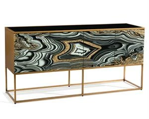 The agate design running across the front of the doors is reverse-hand-painted, above which is a black glass top inset in an Aztec gold frame. The base is also finished in Aztec gold.