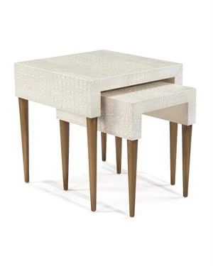 Sitting upon four turned and tapered legs, the tops of this pair of nesting tables are inlaid in crocodile patterned textured resin and finished in a varigated cream and white. The legs are finished in Aztec Gold.