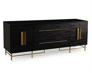 The doors and drawers of this credenza are faced with kazan black, a holistic laminate, and feature brass-plated stainless steel handles. The case is finished in high-gloss black and stands on a brass-finished stainless steel base.