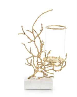 This pillar candle holder is nestled into a branch of hand cast and polished brass branches. At the white marble vase is a cluster of natural quartz crystals. The candle cup will hold up to a 6″ pillar candle not included.