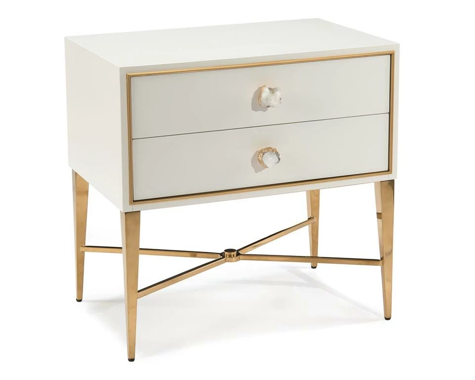 A two drawer nightstand. The case is finished in beluga white with gold detail framing the drawers. The case is mounted on a stainless steel base finished in polished brass. A crystal handle decorates each of the drawer fronts.