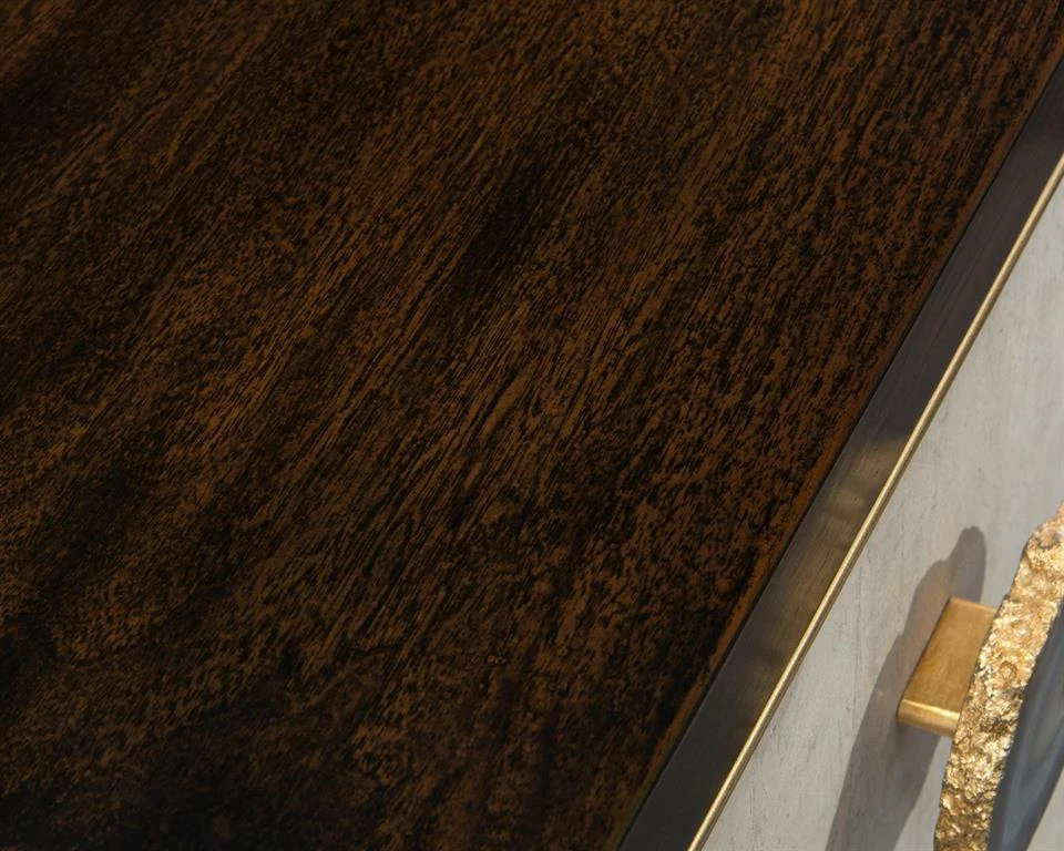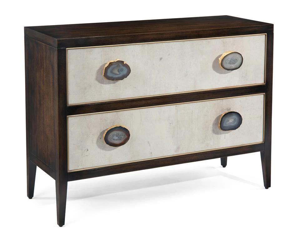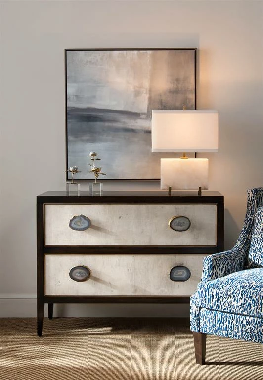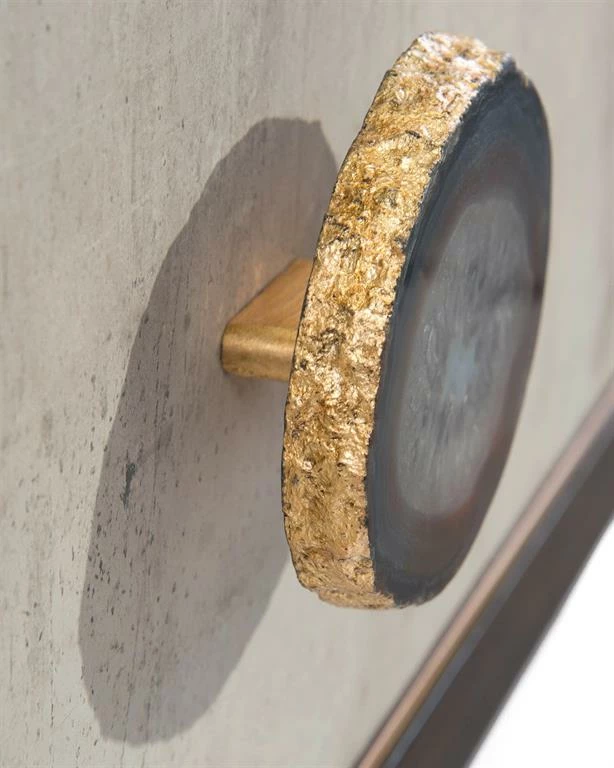 The drawer fronts are faced with tiza gesso set into a Windsor black case. The drawers, fitted with soft-closing, full-extension runners, have natural agate handles with gold-leaf trim.