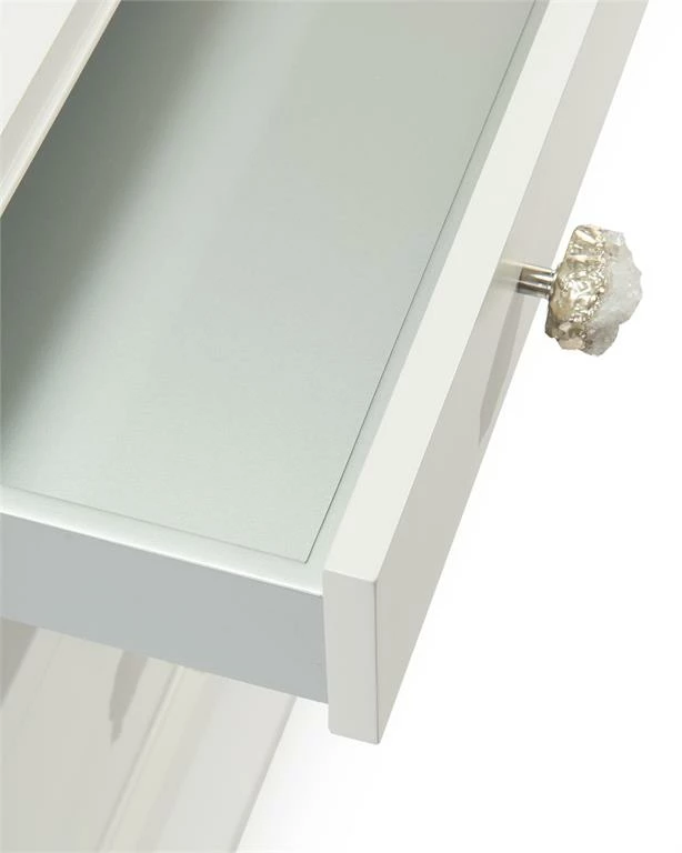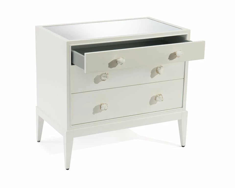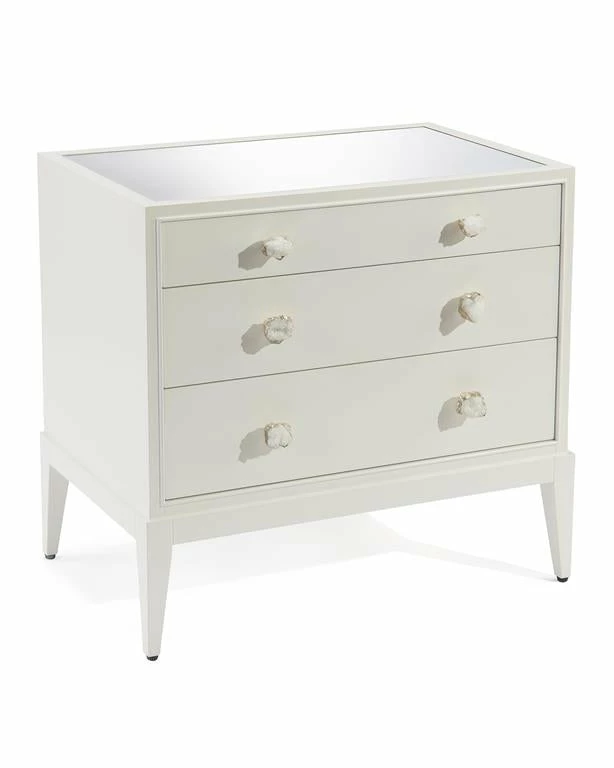 Finished in ice white, this chest features three graduated drawers with silvered crystal handles to the fronts. The carcass is raised on square tapered legs.