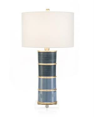 A Polished Brass Pillar Table Lamp with Gradient Sapphire Resin on Acrylic Base. Shade: 17″ X 17″ X 11″, White inside, White outside Man Made Linen Man Made Silk, Round. 3 Way, 150 Watt Max, Type A Bulb, 9″ Gold Harp.