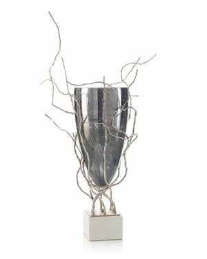 A profusion of sprouting nickel saplings engulf a smoky blue vase. This sculptural piece stands tall on a white marble base.