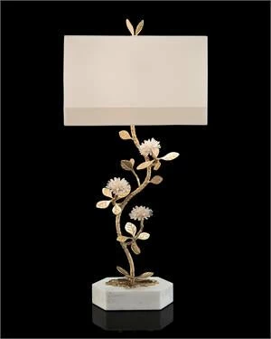 Organic antique brass branched table lamp with quartz crystal flower blooms on a marble base. Shade: (16″ X 12″) X (16″ X 12″) X 12″. Off White outside and White inside, Man-made Linen – Man-made Silk, Rectangle Shade. 3 Way, 150 Watt Max