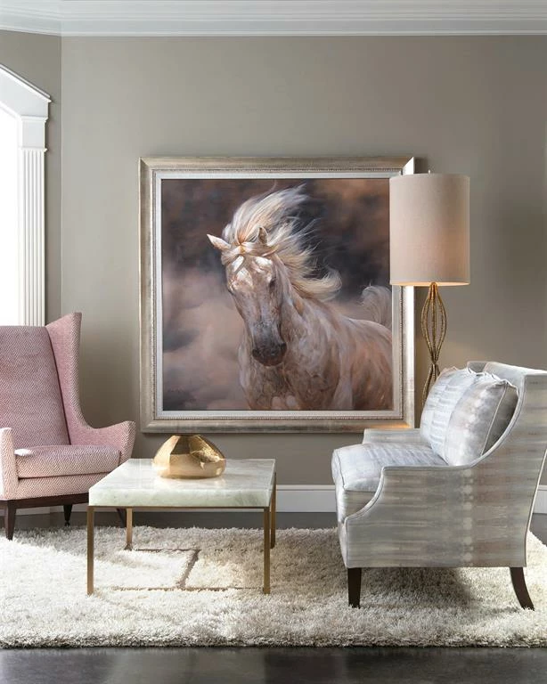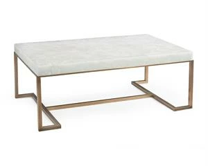 A rectangular natural calcite slab coffee table with an antique brass stand.