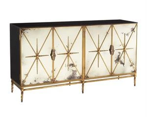 Below the black glass top, the doors and steel base frame are finished in old gold, while the ends are black lacquer. The doors have a central, decorative, carved spiral twist feature applied over the foxed mirror panels.