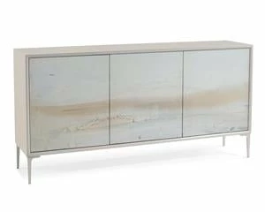 Three-door cabinet in light grey with a giclée of Soft Blue River by Austin Allen James across the doors, each with push-latch mechanisms. The metal legs are in a matching light grey finish.