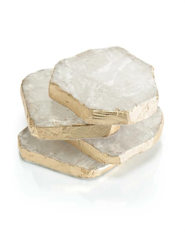 A set of four selenite coasters are rimmed in hand applied gold leaf. This touch of elegance is the perfect hostess gift.