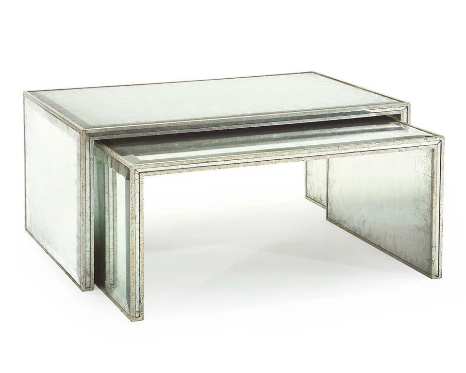 A set of two nesting cocktail tables with an antique silver-leaf finish on the moldings and covered in églomisé throughout. The tables have fingered grips for ease of movement. Sold only as shown in set.