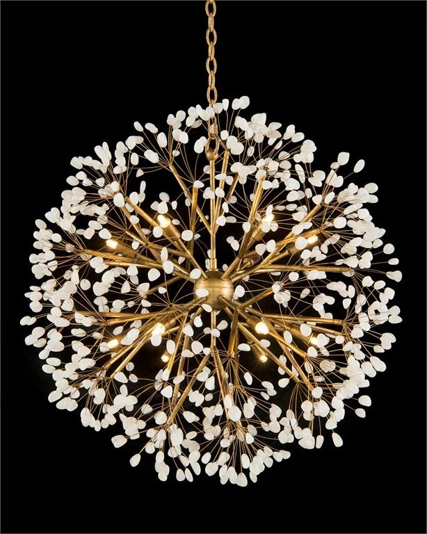 Luminous Spherical Twelve Light Chandelier with an Explosion of Quartz Crystals finished in Gold Leaf. Includes 10 feet of chain. Halogen Type G 9 Bulb, 25 Watt Max Canopy: 6″x1″