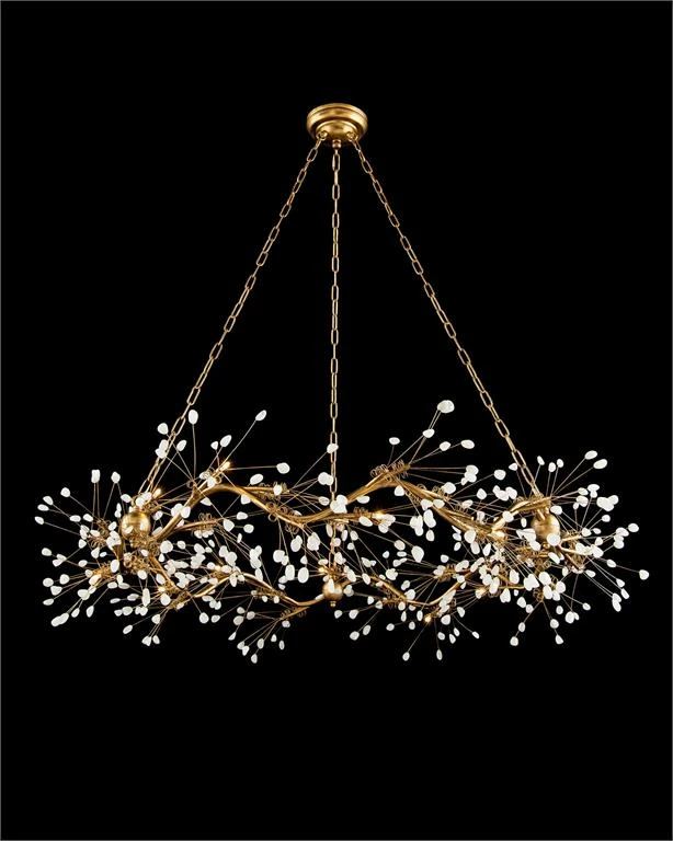 Waving Boughs of Luminous Quartz Crystal in this Twelve Light Pendant with a Gold Leaf Finish. Includes (3) 10 foot of chain. Halogen Type G 4 Bulb.