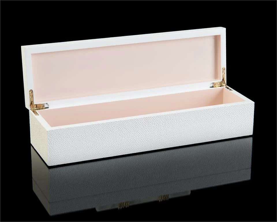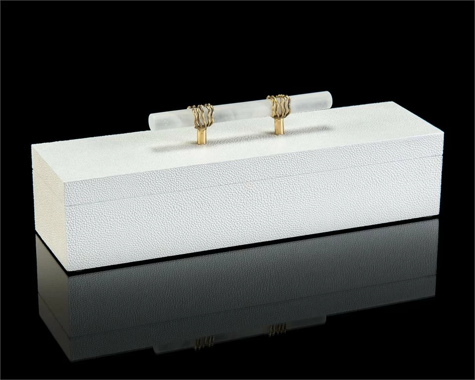 A lovely white enameled box is accented with a handle of brass and alabaster. Lift the lid to find a soft pink interior.
