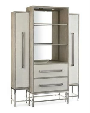 The center section of this cabinet features two linen-faced drawers, an open display area with shelving, a modern mirrored back, and touch lighting. The two outside cupboards are set back and have linen-faced doors.