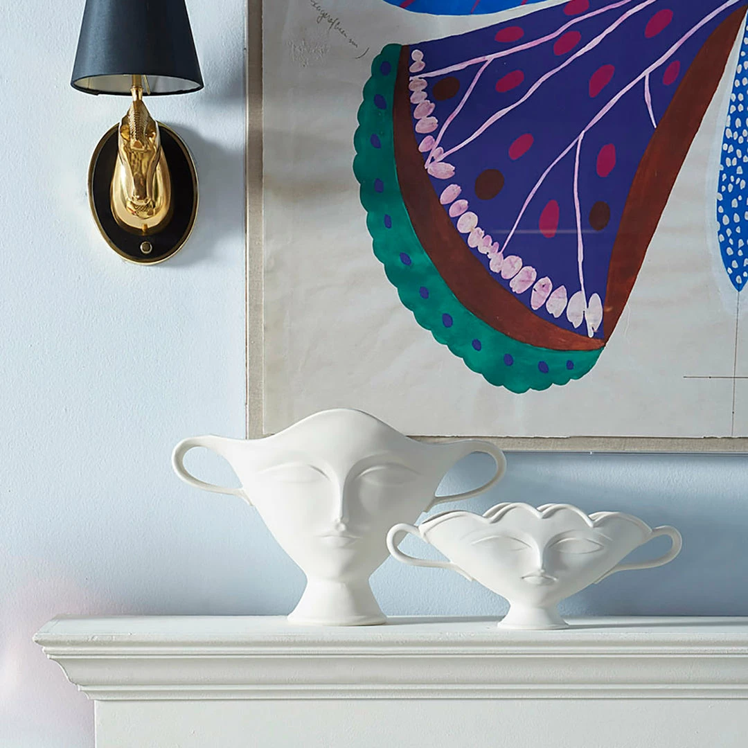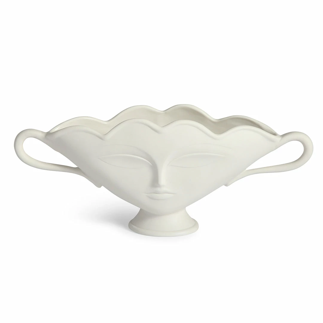 Take your tablescape from so-so to sublime. Made from white porcelain with a matte finish, our spin on this traditional, flower-friendly vessel features our muse Giuliette’s ethereal face (on both front and back) and a lightly scalloped rim. This subtle show-stopper’s shallow depth makes it a match for your mantelscape or console.