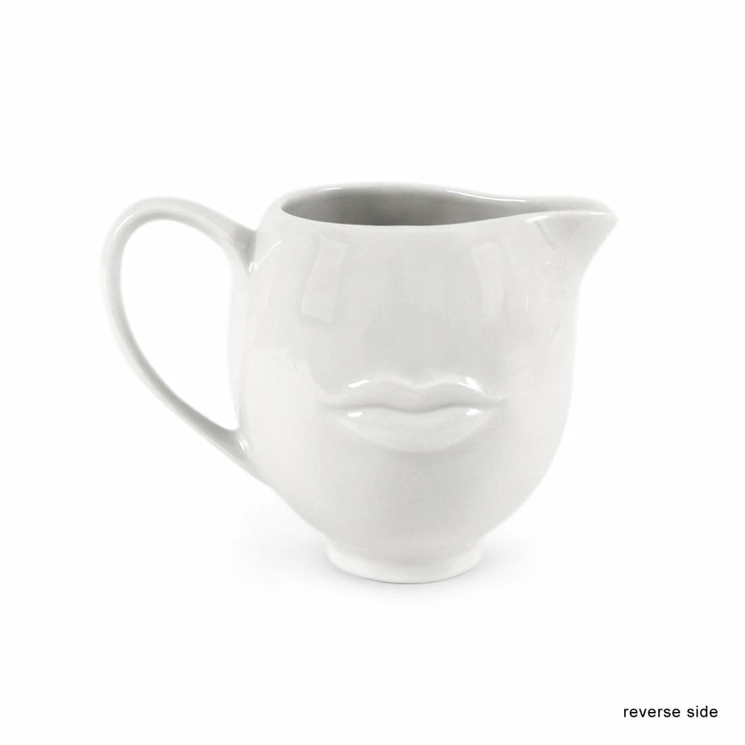Our Muse Reversible Creamer, inspired by our love affair with Salvador and Misia, is hand-sculpted white porcelain with a sheer glossy glaze. Mustachioed on one side, full-lipped on the other.