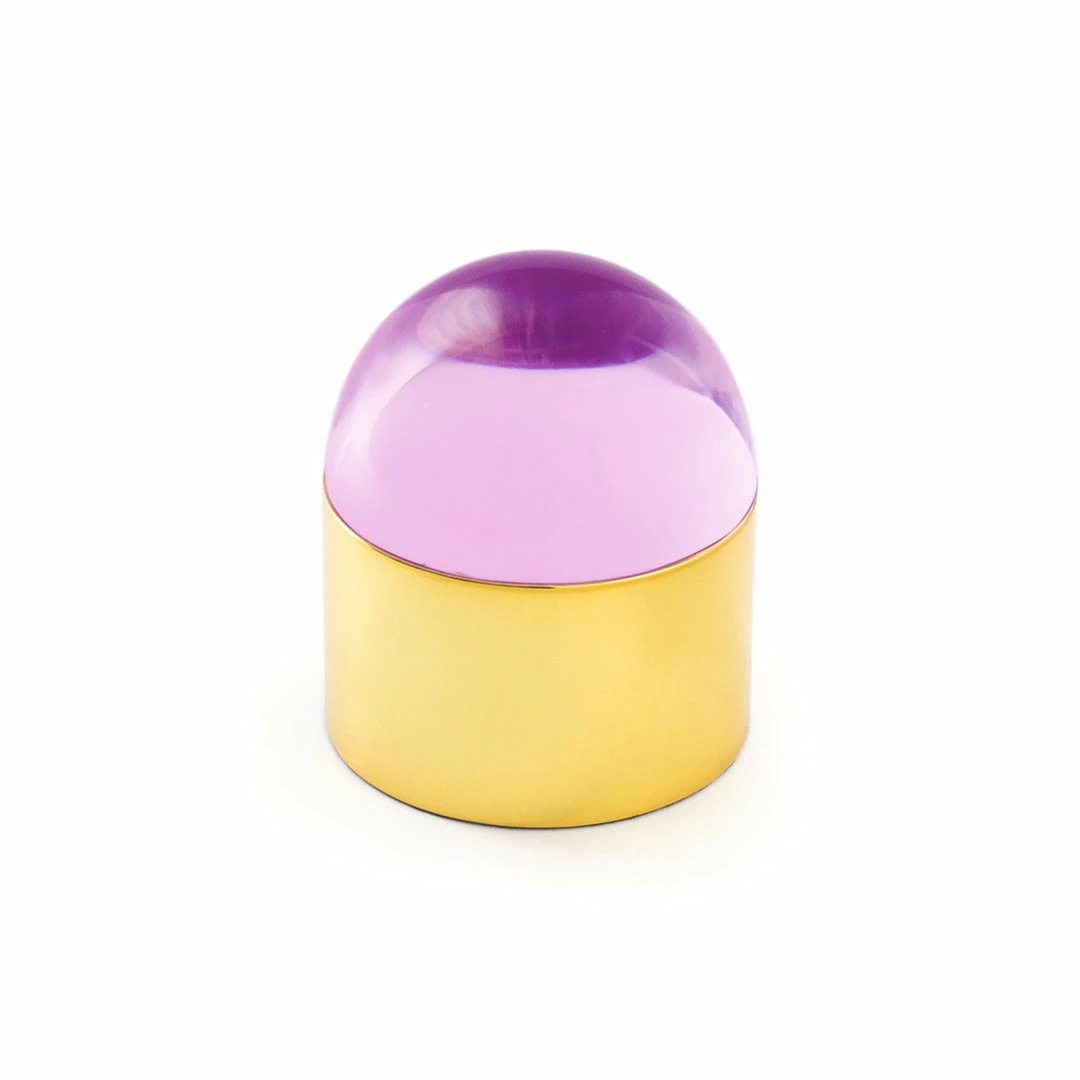 Each polished brass base is topped with a luminous jewel-tone acrylic lid—our Globo Boxes are an intriguing addition to any tabletop, powder room, or cocktail table.