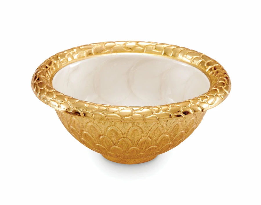 Florentine 4.25″ Round Bowl. Give your gathering the Midas Touch! Illuminate your table with Julia Knight’s Florentine Gold Collection. Knight’s Florentine Gold Collection has an Egyptian-esque look and feel – full of must have silhouettes with hand-sculpted jewelry inspired borders. Each piece is hand painted with a proprietary blend of enamel mixed with crushed mother of pearl powder – making every element unique! These sparkling golden adornments add opulence and warmth to any space – Perfect for a lavish event or an everyday statement piece. Julia Knight’s Florentine 4.25″ Round Bowl is a fabulous piece to use for serving dip or nuts. No matter what you decide, it’s sure to grab the attention of your guests. Mix and match with other pieces from the Florentine Gold & Silver Collections or Golden Florals! Free Store Pickup.