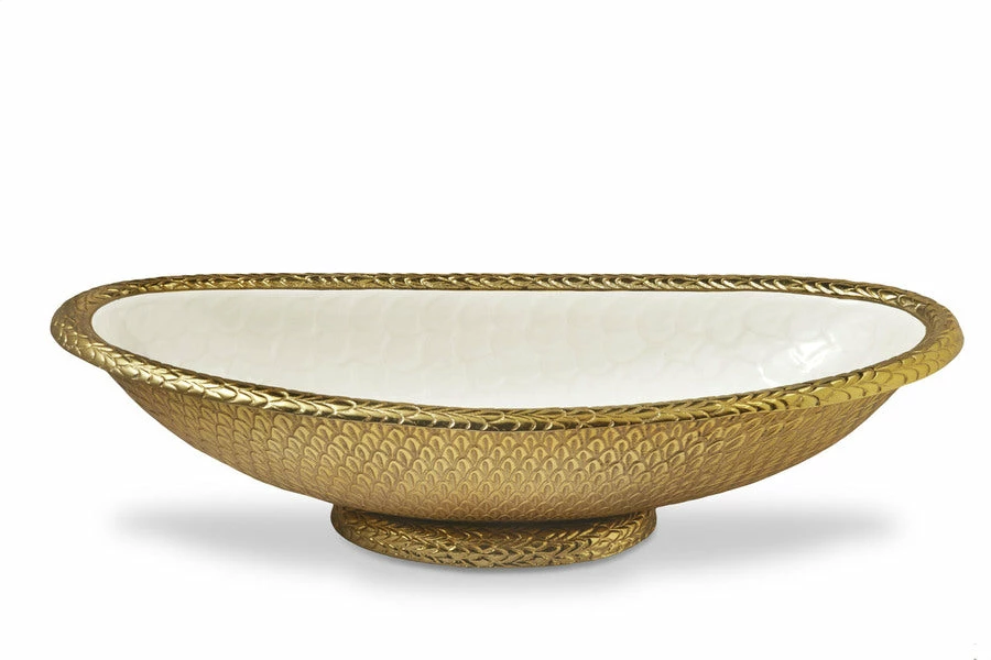 Illuminate your table with Julia Knight’s Florentine Gold Collection. Julia Knight’s Florentine 24″ Oval Bowl is a fabulous vessel to display fresh flowers, fruit or something extravagant at your next dinner party! No matter what you decide, this outstanding oval is sure to grab the attention of your guests. Each bowl is hand painted with a proprietary blend of enamel mixed with crushed mother of pearl powder – making every element unique! These sparkling golden adornments add opulence and warmth to any space – Perfect for a lavish event or an everyday statement piece. Mix and match with other pieces from the Florentine Gold & Silver Collections or Golden Florals! This Oval Bowl qualifies for Free Shipping.