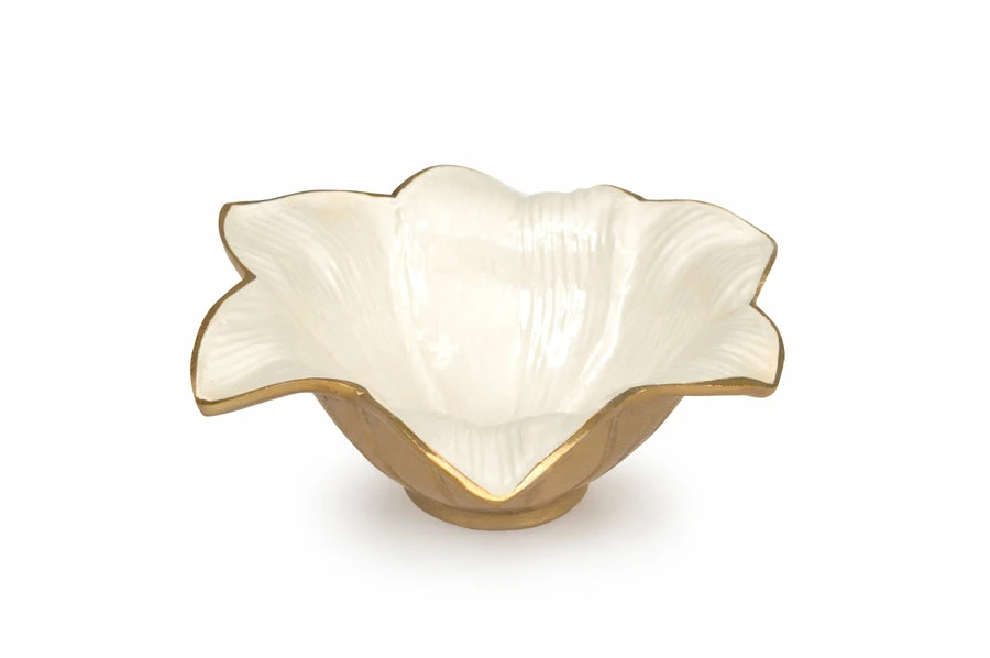 Lily 8″ Bowl. Each Julia Knight Lily 8″ Bowl is individually hand-made of sand cast aluminum – which has been sculpted, polished and finished with a proprietary blend of enamel mixed with crushed mother of pearl powder that is hand painted to form unique capiz-like swirls. Each price is comprised of six petals that form a finely sculptured rim that radiates inwards to fully display the exquisite details of this authentic blossoming beauty. Beautifully mixes and matches with Julia Knight’s other floral and leaf silhouettes to create a flourishingly table display! Each color is a unique mixture that is hand blended – be sure to check out all of our stunning color options! Free Store Pickup.