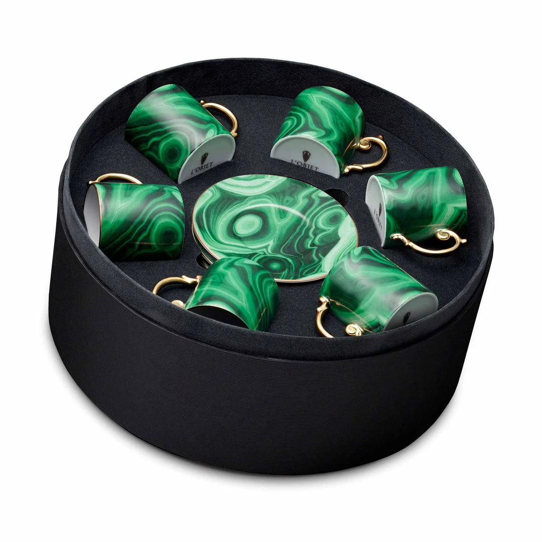 The striking bold of the Malachite collection brings a sophisticated energy to any space. Made of Limoges porcelain and earthenware with hand-gilded 24K gold accents that match the drama of this commanding design.