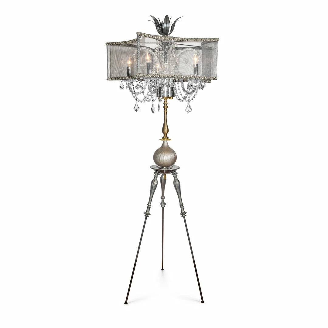 Suspended five arm glass chandelier sits on top of this unique hand forged tripod.