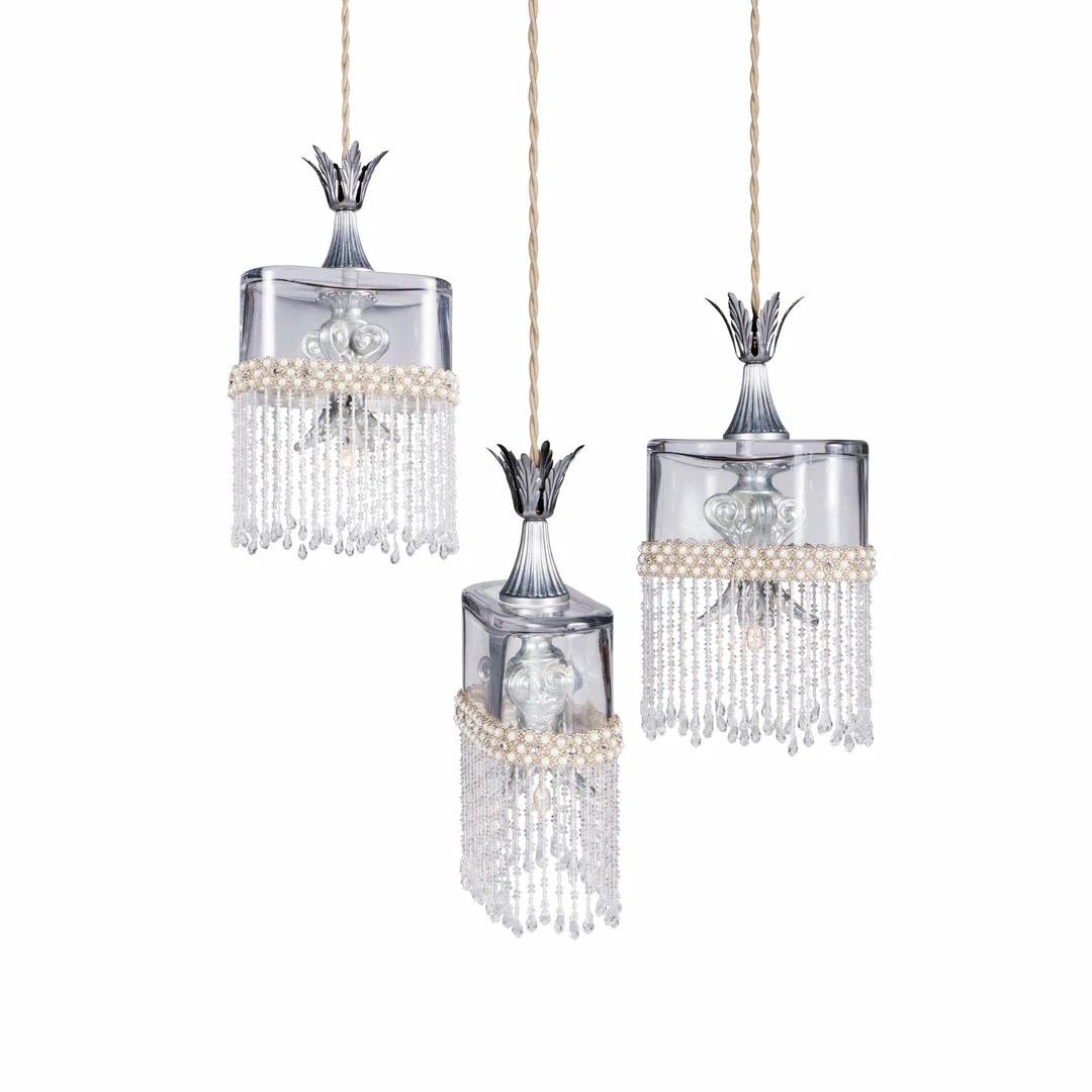 Delicate Metal and glass oval shade pendant. Light and airy hand painted in champagne tones Intricately beaded gimp with clear beads.