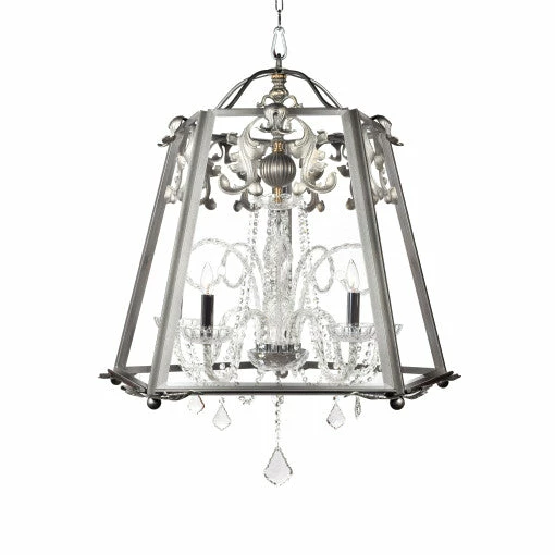 An elegant five-sided transitional wrought iron frame, with removable glass panels, for easy access, and a beautiful clear glass 5 arms chandelier insert.
