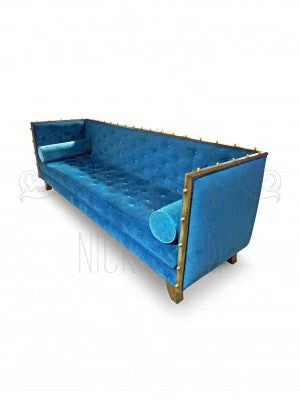 Exquisitely glamorous sofa framed in solid wood frame with solid brass details. Solid wood legs. A multitude of buttons embellish the seat and back with bolsters at each end. Other fabrics and colors available/ swatches available upon request. Other lengths available upon request. 23 Yards. 2 Bolsters included.