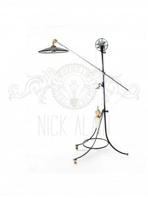 Hand forged iron base with laser cut wheel and details. Iron perforated shade with brass detailing solid marble weight. Small details on front legs. 40 watt standard bulb not included.