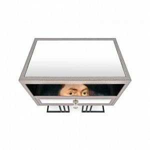 Metal frame table with mirror. Mirror inside with image of prince. Table includes half moon light and switch.