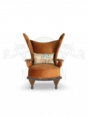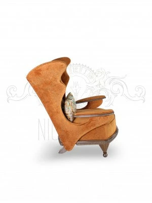Solid wood frame with bronze colored nail heads. Arms rests with solid wood apron and metal legs. Chair tilts towards back for comfort. 21″ x 14″ pillow included. Many colors and fabrics available/swatches upon request.