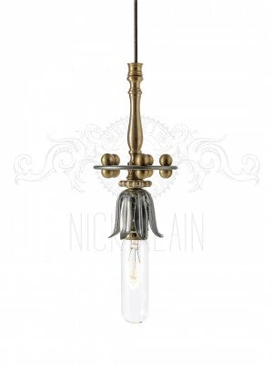 Suspended from a 40″ iron disk are 13 pendants resembling rains. Each pendant is hand crafted and made of iron with brass details. Length of each pendant is 6 feet long and can be adjusted to various sizes. Additional length can be requested at additional charge. Tubular 40 watt bulb included, bulb available at your local hardware store.