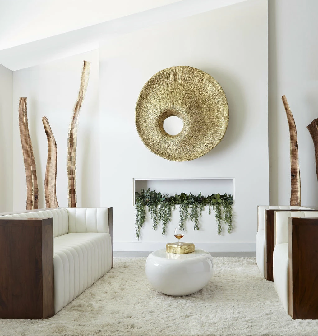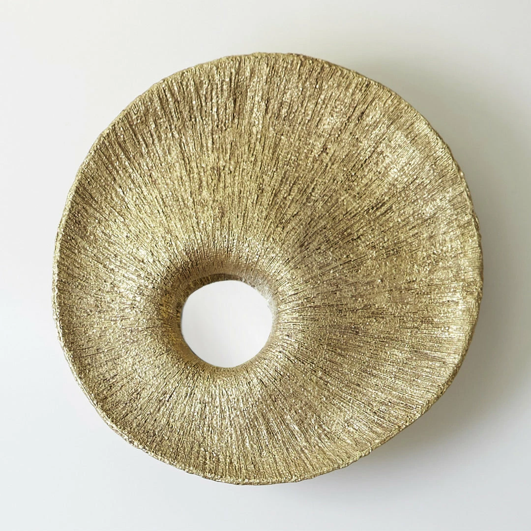Our Convergence Mirror is cast in artisan-grade resin and dressed in shimmering gold leaf. Generous in scale, the mirror measures nearly five feet in diameter and a foot off the wall. This makes for a dimensional wall piece that is really a showstopper.