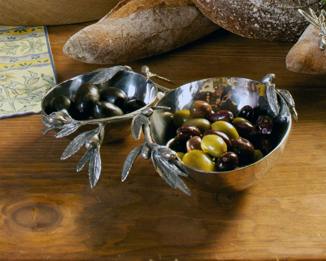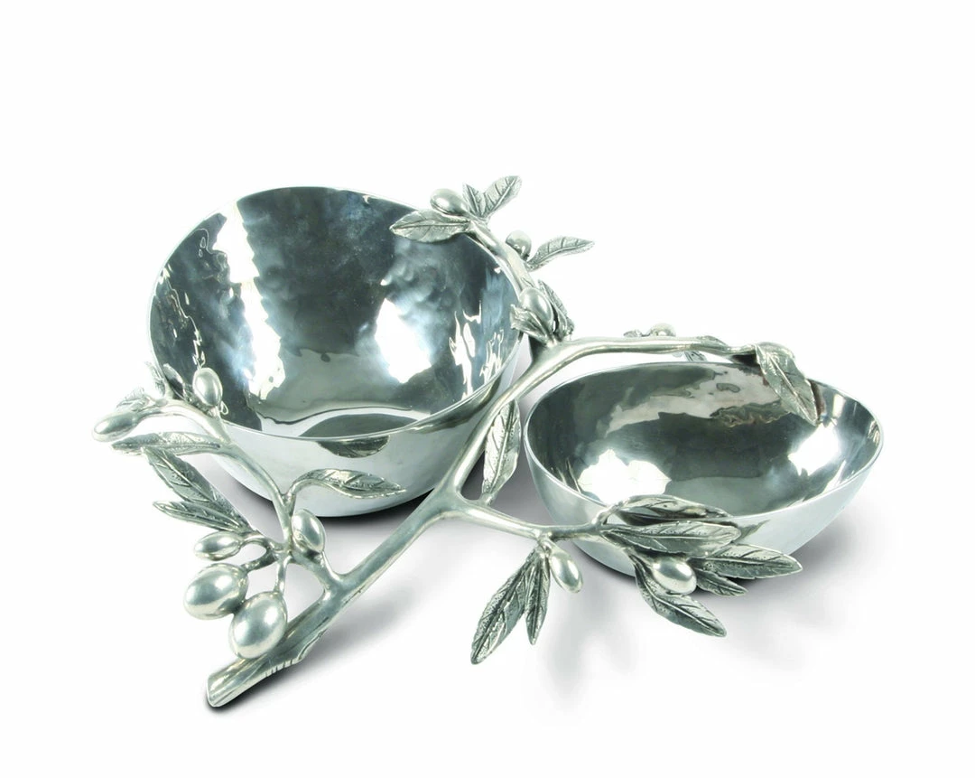 Offer peaceful greetings and delicious snacks to your guests with Vagabond House’s Olive Double Serving Bowl. An olive branch stabilizes this piece as the handle, while leaves and fruit extend off of its pure-pewter design. The stainless steel bowls gleam against the veiny foliage and intricate lines within the figural wood.