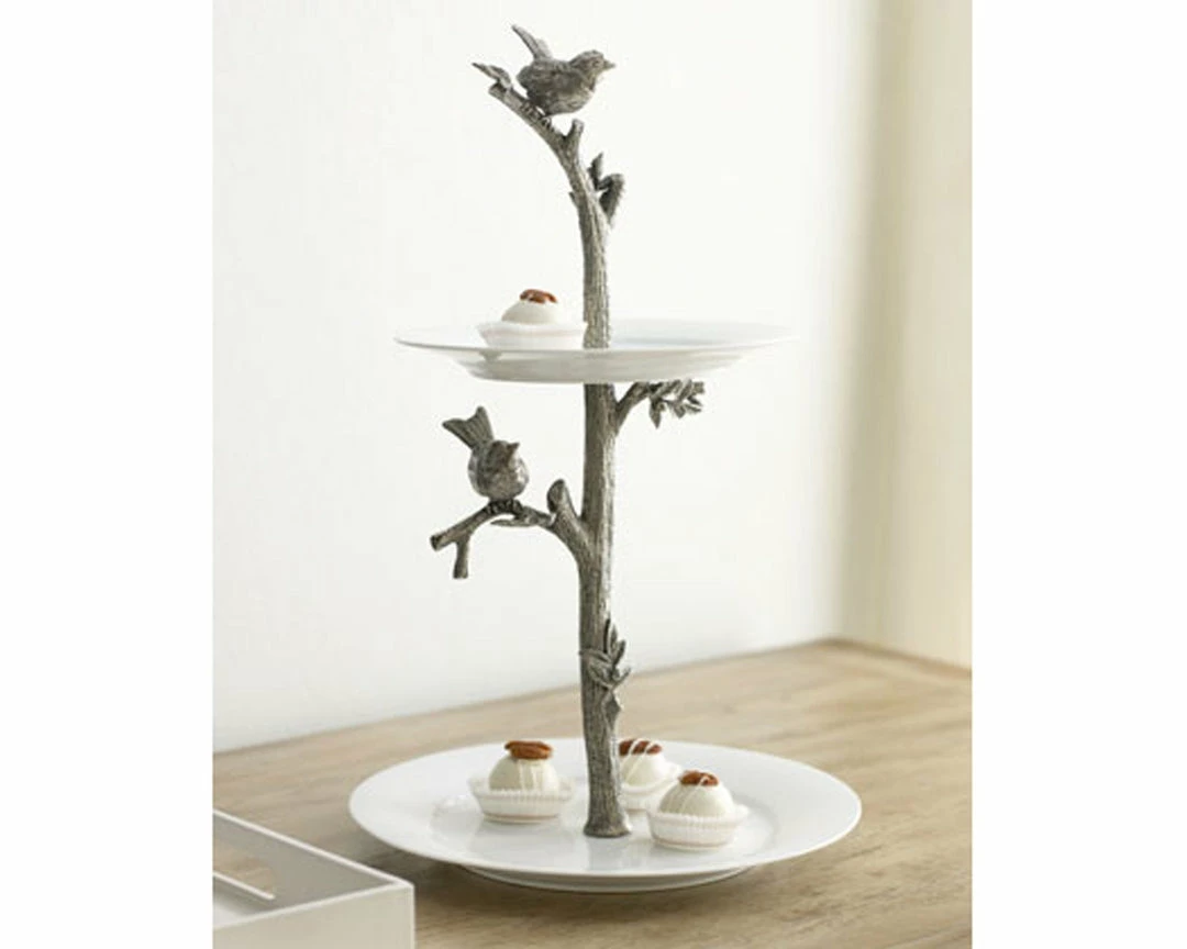 Two lively singers perch on twigs of the branch that forms the shaft of the stand. Rendered in pure Vagabond House pewter, with our signature attention to intricate detail, the branch supports the 2nd round stoneware plate of the stand.Â