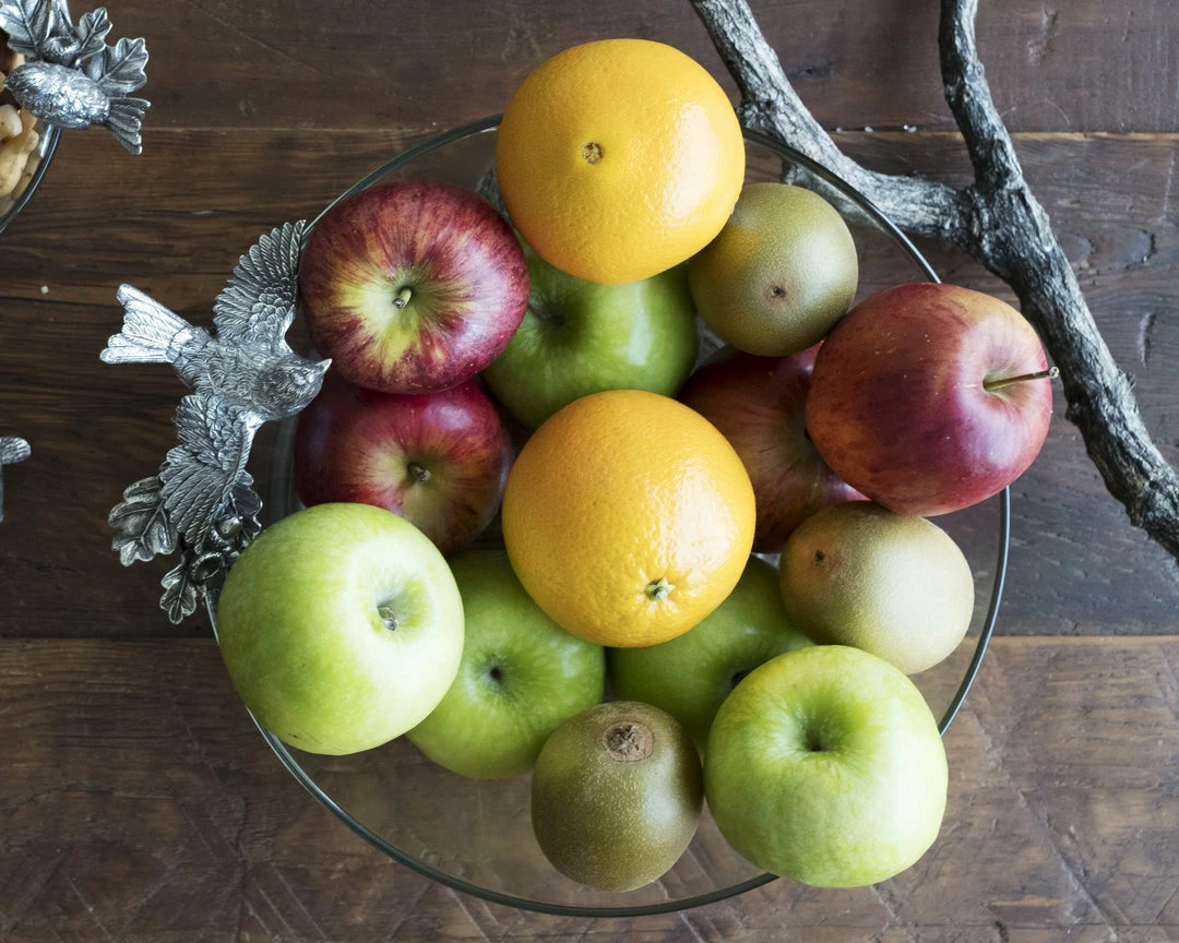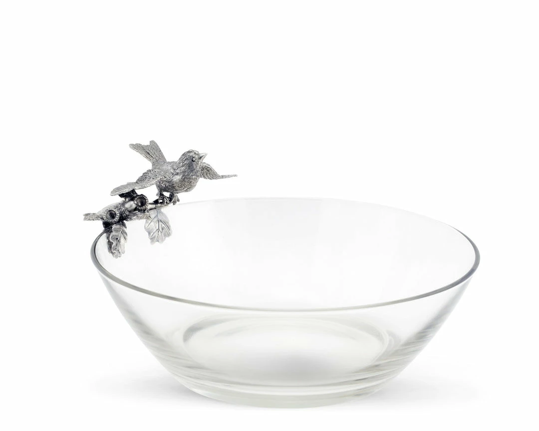 A heavy glass, crystal clear serving bowl is always needed to showcase beautiful culinary creations. Our Songbird Glass bowl is embellished with a sweet, pewter still life of our signature Songbird perching on an oak branchlet surrounded by oak leaves and acorns.