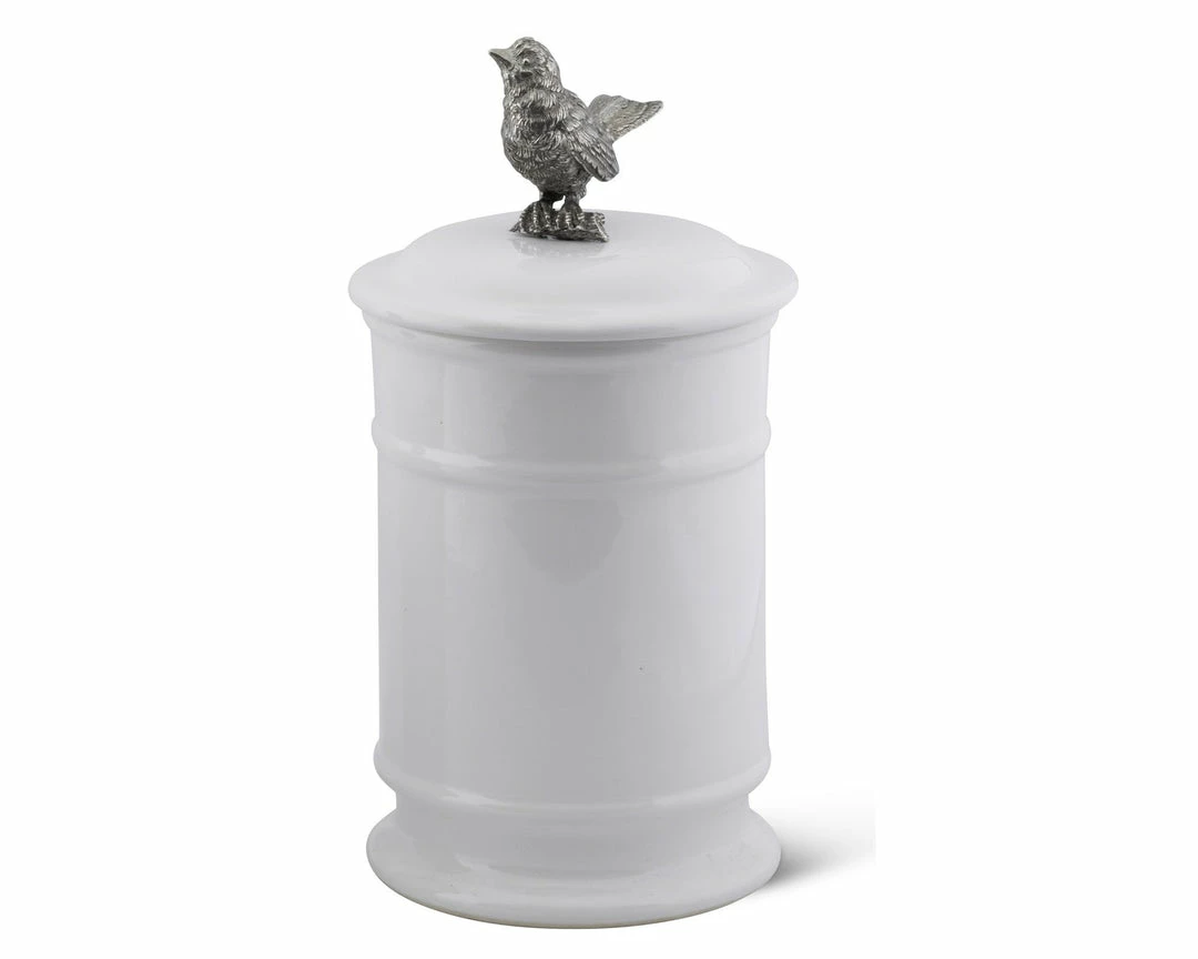 A mini-statue of our signature Song Bird in pure pewter tops Vagabond House’s Song Bird Canisters. The saucy little singer makes a handy handle atop our lustrous, double-glazed, twice fired fine stoneware canisters. Available in 2 sizes.